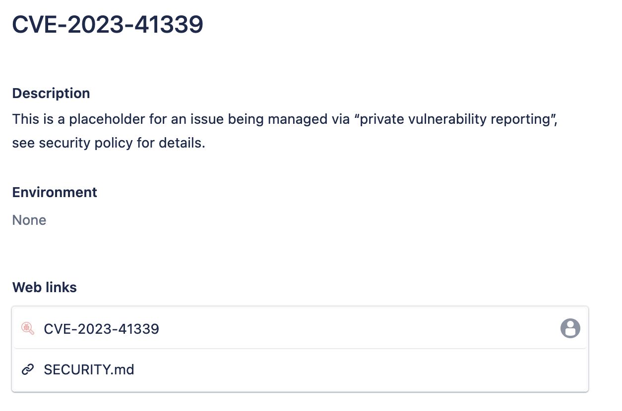 Example: The report "GHSA-cqpc-x2c6-2gmf" has been assigned CVE-2023-41339 and is shown as "not yet published".