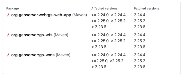 org.geoserver.web:gs-web-appasgeoserver.waras a useful way to document that thegeoserver.warincludes other jars - Affected versions: It is difficult to communicate version ranges, due to limitations in CVE advisory processing, requiring multiple lines.