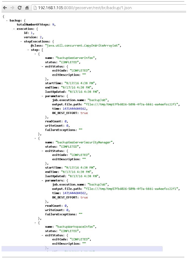 GeoServer will respond with the status of the backup job corresponding to that ID