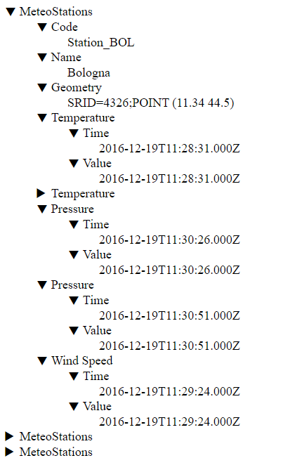 aggregate(stream(->meteo_observations,filter('value > 35')),AVG)will compute and return the average value of all the Observation nested feature value attribute.aggregate(stream(->meteo_observations.->meteo_parameters,sort("ASC",param_name),param_unit),JOIN(,))will pick up themeteo_parameternested features for each station feature, will sort them in ascending order based on the value of theparam_nameand will concatenate theparam_unitvalues in a single string, comma separated.