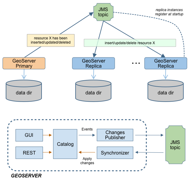NO DATA IS SENT THROUGH THE JMS CHANNEL The clustering solution we have put in place is specific for managing the GeoServer internal configuration, no data is transferred between primary and replicas. For that purpose use external mechanisms (ref. [GeoServer REST]). In principle this is not a limitation per se since usually in a clustered environment data is stored in shared locations outside the data directory. With our solution this is a requirement since each replicas will have its own private data directory.