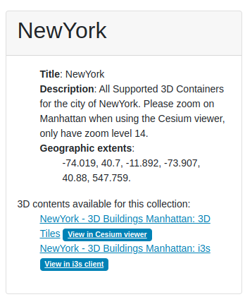 The contents of the collections.json file will be exposed both in collections and single collection resources. If Cesium 3D tiles are found, a Cesium viewer link will be added to the collection HTML representation, if i3s tiles are found, a i3s viewer link will be added too.