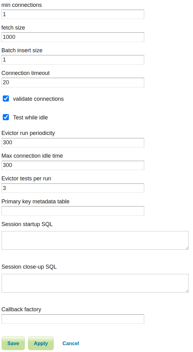 Connection pool configuration parameters. See the Database Connection Pooling section for details. |