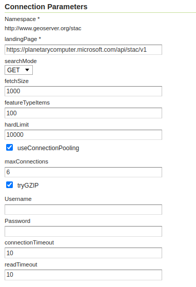 landingPage: this should point to the landing page of the target STAC APIfetchSize: how many items the store will try to fetch per page. The actual number is in control of the server, the store will simply try to suggest this value.featureTypeItems: how many items to read in order to guess the structure of the feature type (GeoServer in general needs a predictable structure)hardLimit: maximum amount of items to fetch from the STAC store, in any request (it's a good idea to pose a limit, as many STAC APIs host millions of items, and the data transfer is not particularly efficient due to the large size of items, and the paged transfer)