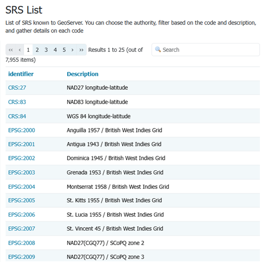 Listing of all Spatial Referencing Systems (SRS) known to GeoServer