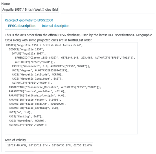 The title of each SRS is composed of the author name and the unique integer identifier (code) defined by the Author. In the above example, the author is the European Petroleum Survey Group (EPSG) and the Code is 2000. The fields are as follows: