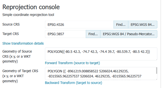 For example, you can use the reprojection console to transform a bounding box (as a WKT polygon or line) between different CRSs.