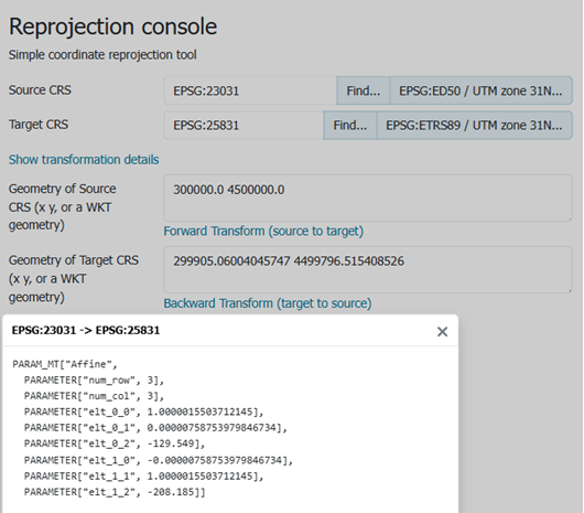 The reprojection console allows you to calculate and test coordinate transformation. You can input a single coordinate or WKT geometry, and transform it from one CRS to another.