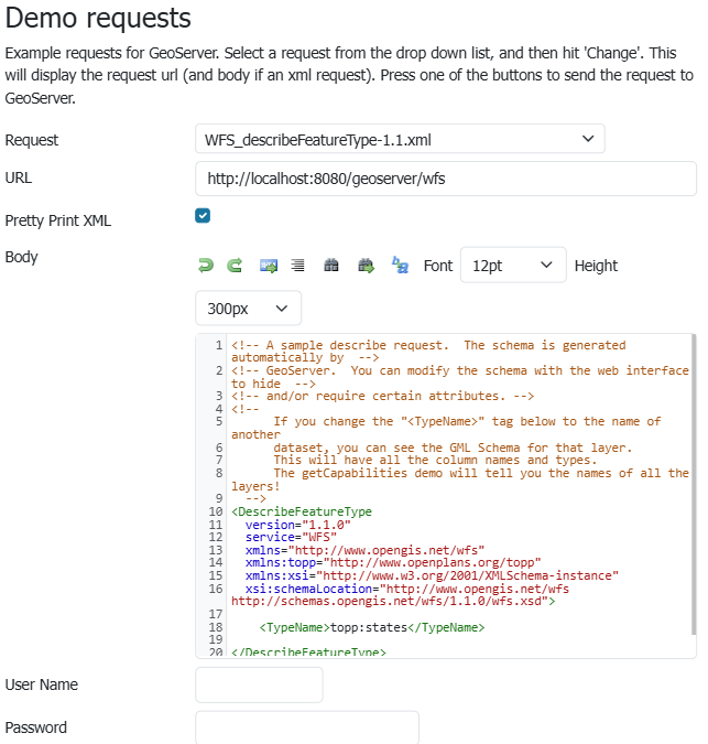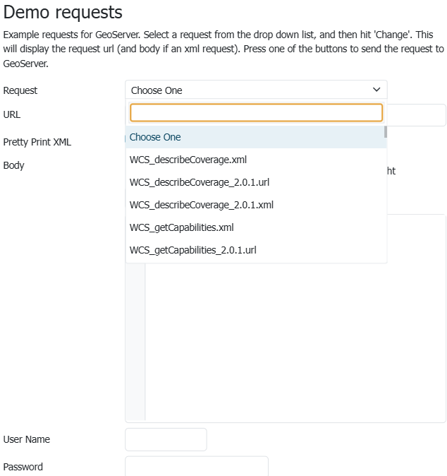 This page has example WMS, WCS, and WFS requests for GeoServer that you can use, examine, and change. Select a request from the drop down list.