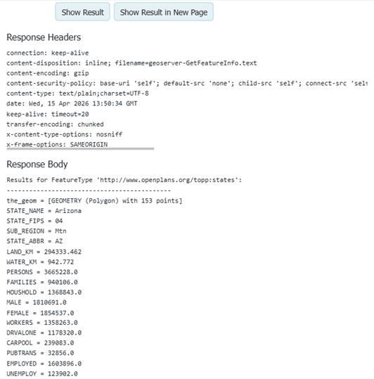 Show Result in New Page will show GeoServer's result in a new page (your browser will render the result).