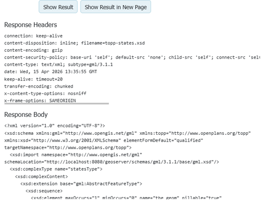 Show Result will show GeoServer's response - both the response headers and the XML/image result - below the Show Result button. If GeoServer's response is XML and you have ticked Pretty Print XML, GeoServer's response will be shown with an easy to read styled formatting.