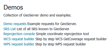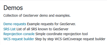 This page contains helpful links to various information pages regarding GeoServer and its features. You do not need to be logged into GeoServer to access this page.