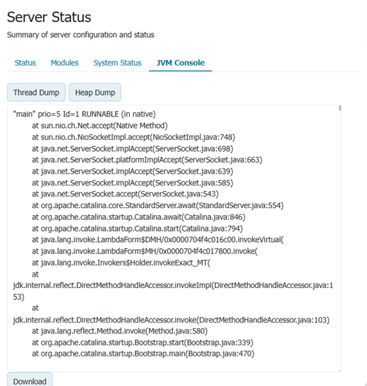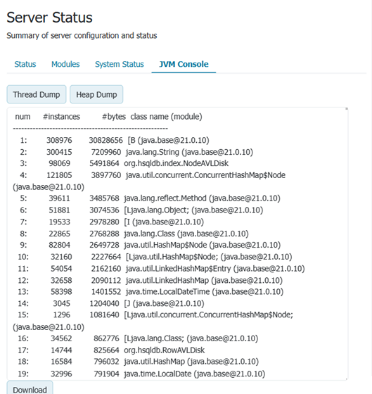 For information on the live Java Runtime Environment the JVM Console tab provides access to two useful troubleshooting tools.