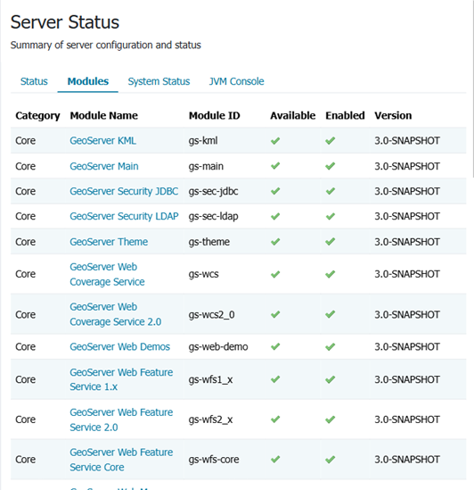 | Available | Whether the module is available to GeoServer. A database extension requiring a third-party database driver to be installed would not be available for use. |