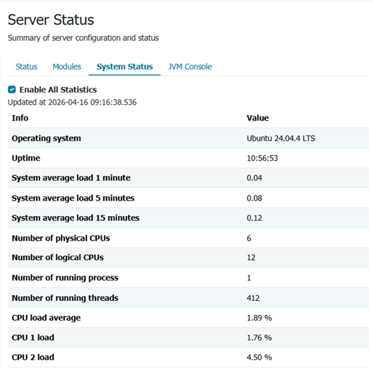 Use the checkbox Enable All Statistics to start and stop the collecting and displaying system status information. Disabling is useful if GeoServer is generating a high CPU load due to system status collection.