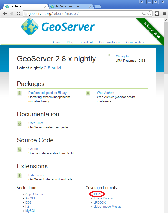 2. The download link for GDAL will be in the Extensions section under Coverage Format.
