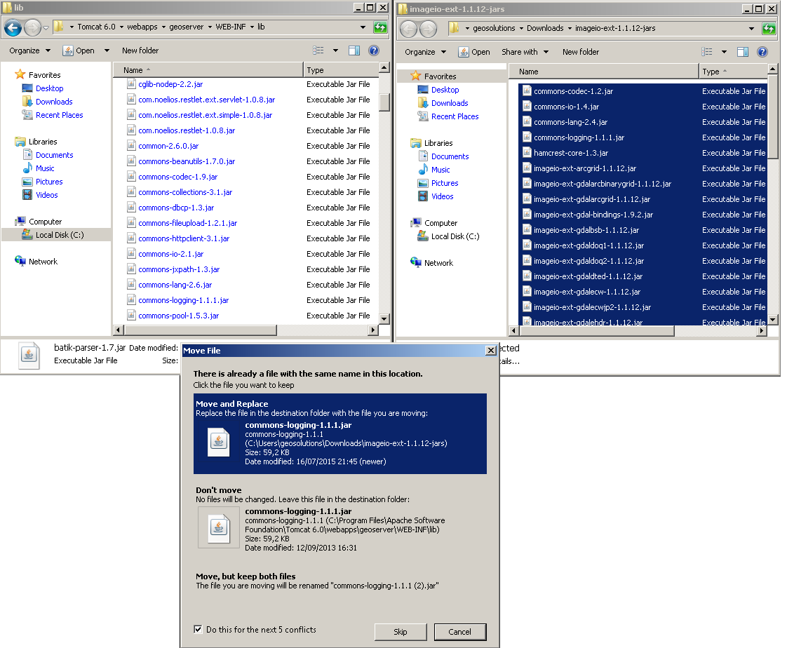 • Extract the files in this archive to the WEB-INF/lib directory of your GeoServer installation. On Windows You may be prompted for confirmation to overwrite existing files, confirm the replacement of the files