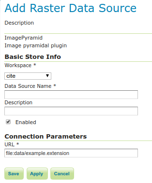 Once the extension is properly installed ImagePyramid will be an option in the Raster Data Sources list when creating a new data store.