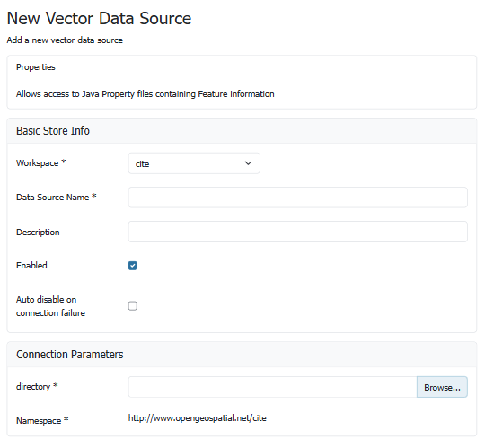 By default, Properties will be an option in the Vector Data Sources list when creating a new data store.