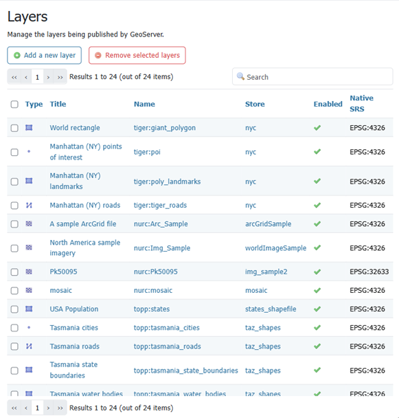 In the Layers section of the web interface, you can view and edit existing layers, add (register) a new layer, or remove (unregister) a layer. The Layers View page displays the list of layers, and the Store and Workspace in which each layer is contained. The View page also displays the layer's status and native SRS.