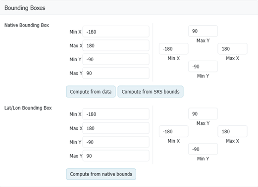 - Native Bounding Box---The bounds of the data specified in the Native SRS. These bounds can be generated by clicking the Compute from data button or they can be generated from the SRS definition by clicking the Compute from SRS bounds button. The SRS used depends on the SRS Handling chosen: the declared SRS when Force declared or Reproject native to declared are chosen, otherwise the native SRS is used. If the SRS does not have a bounding defined then none is generated.
