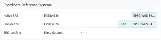 For Cascaded WMS and WMTS servers and WFS-NG layers with multiple supported CRSs in the capabilities document, the Native CRS can be selected by clicking the Find button next to the Native SRS field.
