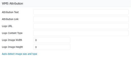 - Logo Content Type, Width, and Height---These fields provide information about the logo image that clients may use to assist with layout. GeoServer will auto-detect these values if you click the Auto-detect image size and type link at the bottom of the section. The text, link, and URL are each advertised in the WMS Capabilities document if they are provided. Some WMS clients will display this information to advise users which providers provide a particular dataset. If you omit some of the fields, those that are provided will be published and those that are not will be omitted from the Capabilities document.
