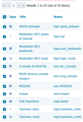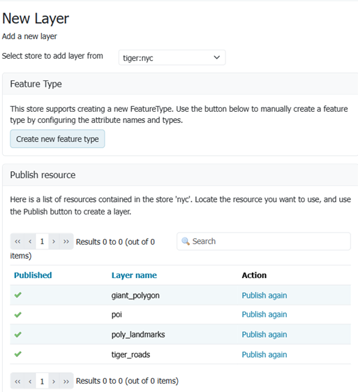 Upon selection of a Store, a list is displayed of resources within the store. Resources which have already been published as layers are listed first, followed by other resources which are available to be published. In this example, giant_polygon, poi, poly_landmarks and tiger_roads are all existing layers within the NYC store.