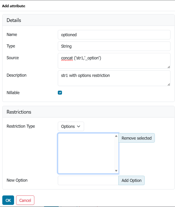 For numeric or string types, the dialog also allows defining restrictions on the attribute value, which will be reported wherever the feature type is described. The restrictions set for an attribute are then available to clients, who may enforce them before applying changes to the feature type.