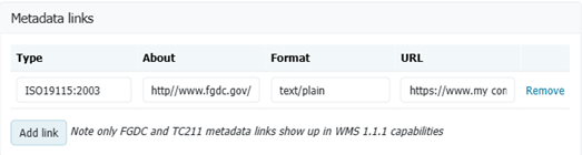 Metadata Links---Allows linking to external documents that describe the data layer. The "type" input provides a few example types, like FGDC or ISO19115:2003, but allows any other type to be declared. The optional "About" entry can be used to point to the definition of the metadata standard, or any other side information about it. Finally, "URL" points to the actual metadata, while "Format" provides its mime type.