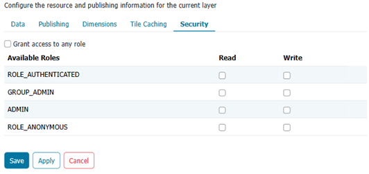 To create/edit layer's data access rules simply check/uncheck checkboxes according to desired access mode and role. The Grant access to any role checkbox grant each role for each access mode.