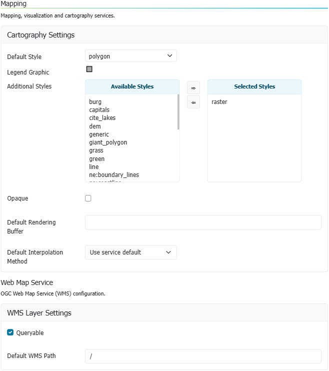 - Default Interpolation Method---Allows to specify a default resampling (interpolation) method for this layer. The available options are Nearest neighbor, Bilinear, Bicubic, or Use service default, which means that no layer specific configuration will be created (the default interpolation method selected in the WMS service configuration page will be used, see Raster Rendering Options for details). Can be overridden by the interpolations vendor parameter.