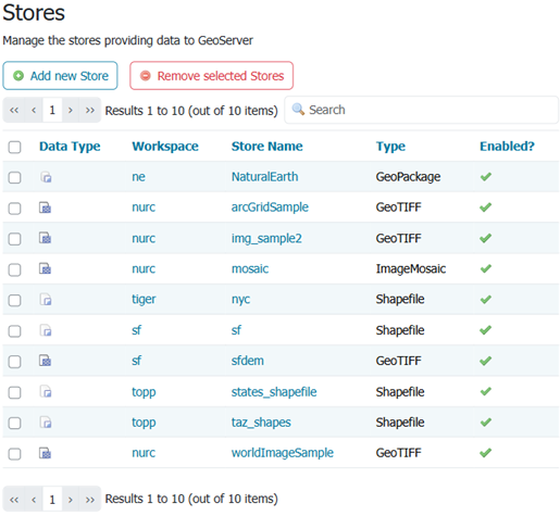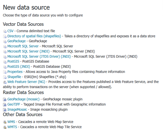 While there are many potential formats for data sources, there are only four kinds of stores. For raster data, a store can be a file. For vector data, a store can be a file, database, or server.
