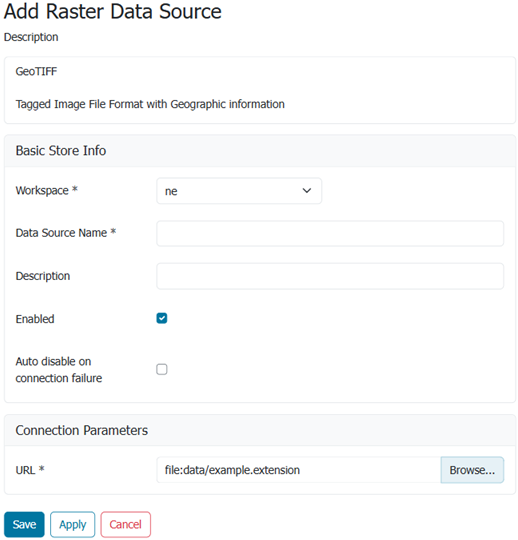 The next page configures the store. Since connection parameters differ across data sources, the exact contents of this page depend on the store's specific format. See the sections Vector data, Raster data, and Databases for information on specific data formats. The example below shows the GeoTIFF raster configuration page.