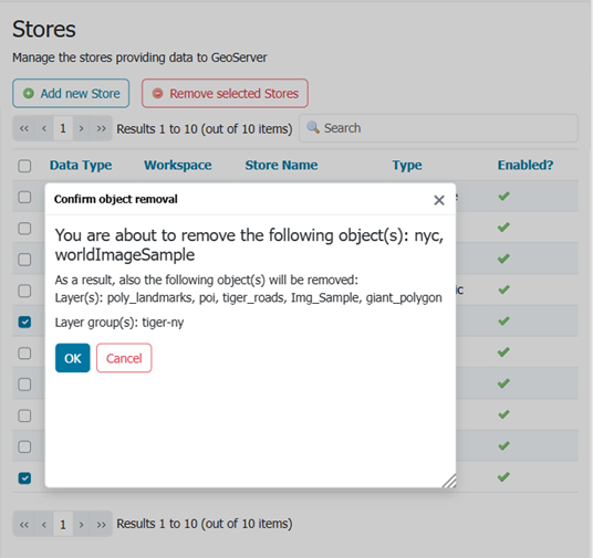 Click the Remove selected Stores button. You will be asked to confirm the removal of the configuration for the store(s) and all resources defined under them. Clicking OK removes the selected store(s), and returns to the Stores page.