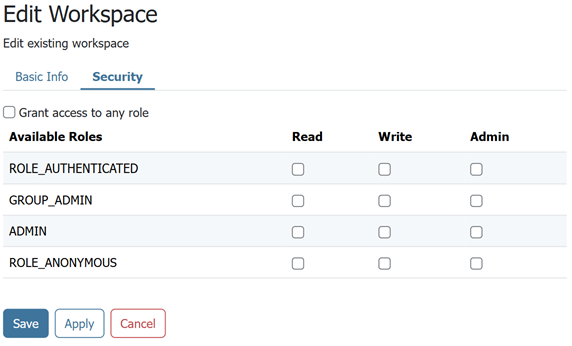 To create/edit the workspace's data access rules, check/uncheck checkboxes according to the desired role. The Grant access to any role checkbox grant each role for any access mode.