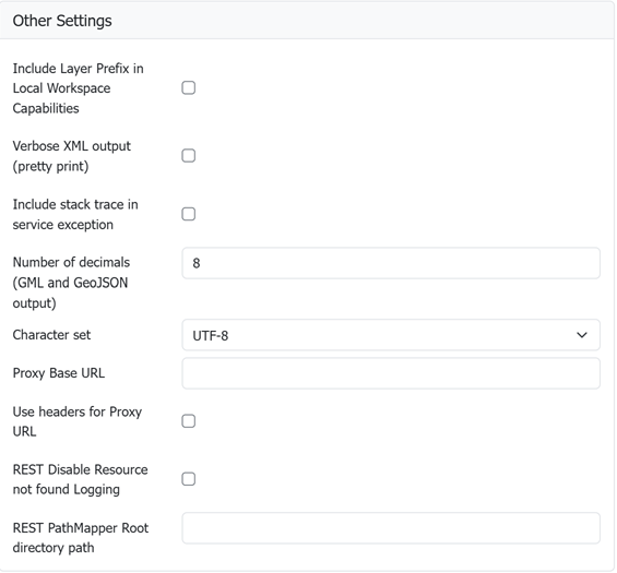 - Include Layer Prefix in Local Workspace Capabilities: Enable this setting to force the inclusion of the workspace name as a prefix when accessing workspace contents as a virtual web service. The layer