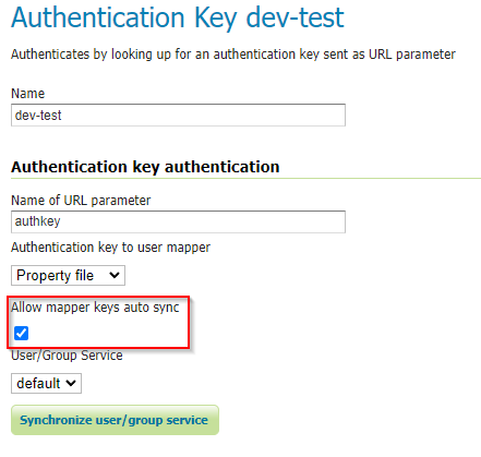 This key provider uses a user property UUID to map the authentication key to the user. User properties are stored in the user/group service. Synchronizing is simple since the logic has to search for users not having the property UUID and add it. The property value is a generated UUID.