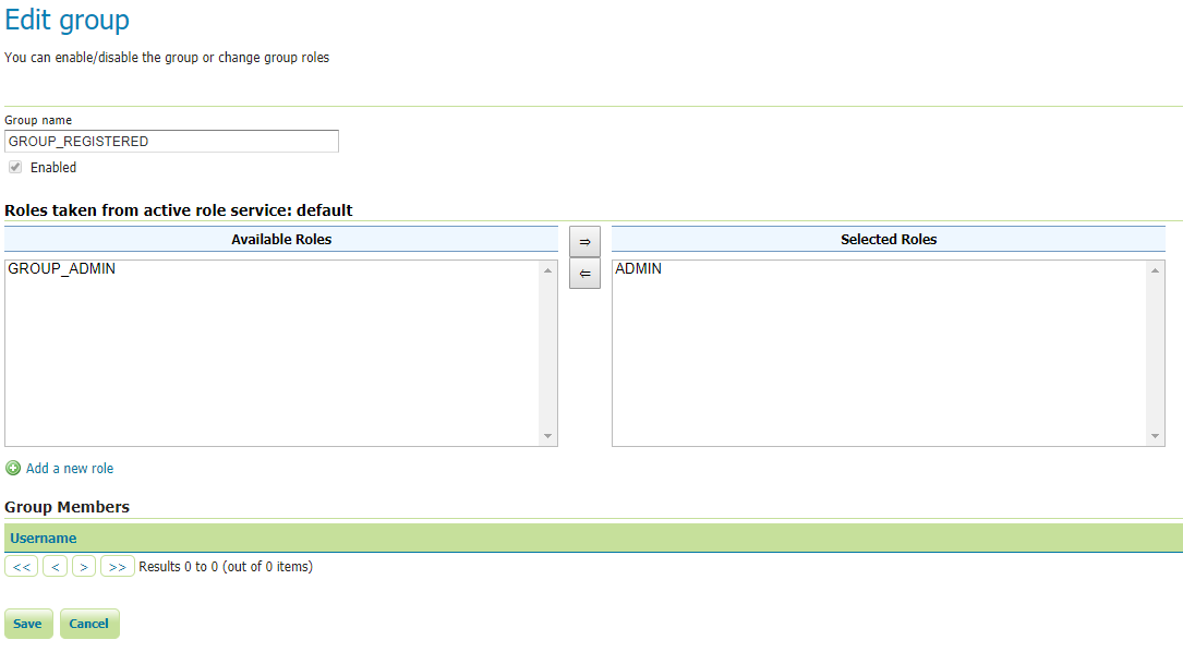 GeoServer Role Serviceyou use. By default, the internalGeoServer Role Servicecan map Roles and Groups through static configuration stored on the GeoServer Data Dir. This is possible by editingGeoServer User Groupdetails from theUsers, Groups, and Rolespanel