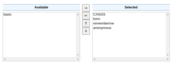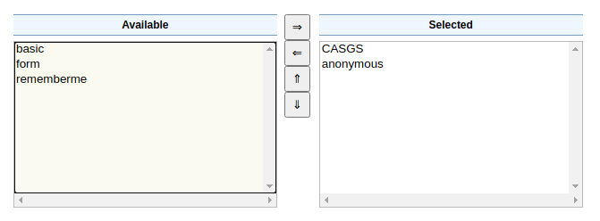 - Add it to the authentication chains, taking care of removing the other authentication methods (or the CAS authentication won't trigger and redirect users to the CAS login page)