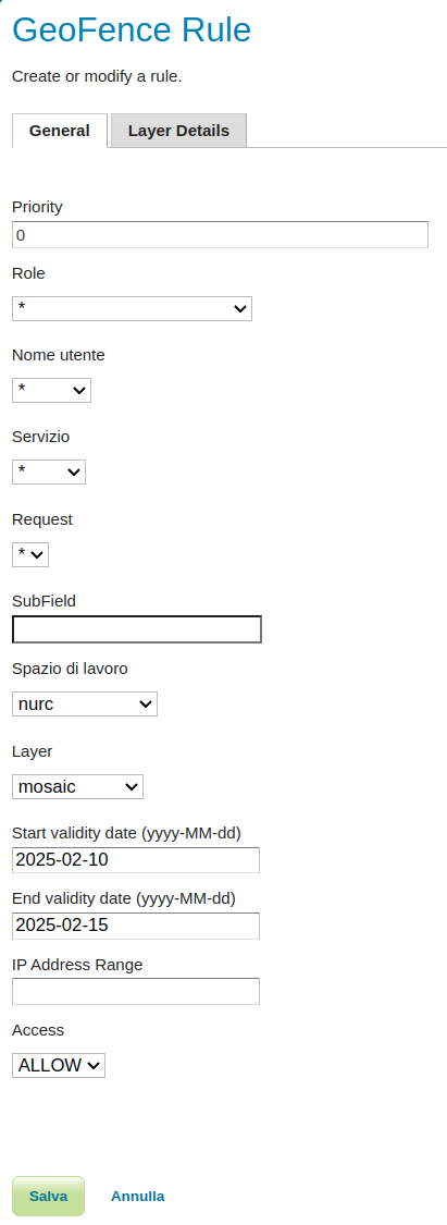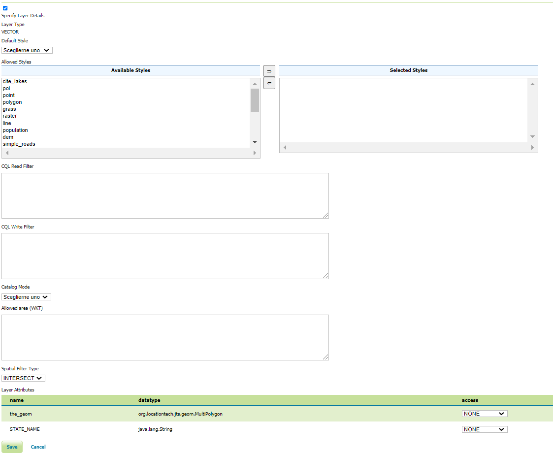 When Access type ACCESS is selected as well as a specific layer, it becomes possible to specify the "layer details" in a separate tab. These make it possible to add additional filters to the layer for the rule in question. For example, the rule can alter the default style of the layer, specify which styles are available at all, which attributes are accessible for reading and/or writing, specify CQL filters for both reading and writing, specify a catalog mode, and an allowed area (WKT) filter.