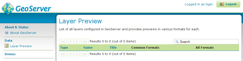 - Login again in GeoServer as user tiger and you will see in Browse Layers all the layers in the
