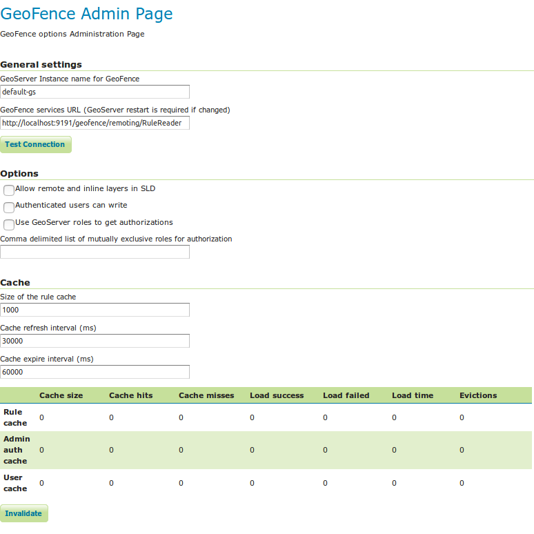 - GeoServer services URL: this is how GeoServer knows how to connect to the external GeoFence server. When using an internal GeoFence server, this is not configurable. For example "http://localhost:9191/geofence/remoting/RuleReader" for an external GeoFence server on localhost.
