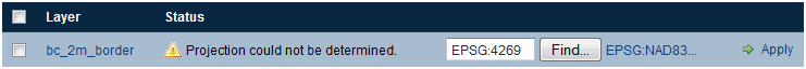 A common issue during the import process is when a CRS cannot be determined for a given layer. In this case, a dialog box will display where the CRS can be declared explicitly. Enter the CRS and Click Apply.