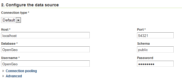 There are also advanced connection options, which are common to the standard PostGIS store loading procedure. (See the PostGIS data store page in the GeoServer reference documentation.)