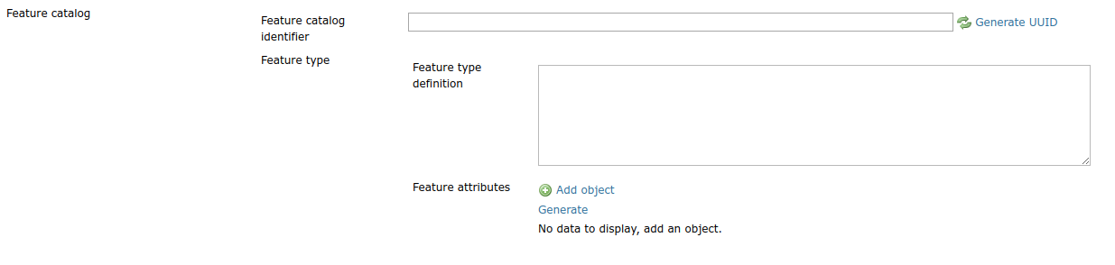 In the example the featureCatalog object has two attributes. A unique identifier of the type UUID and the feature attribute field.
