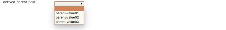 A derived field is a hidden field whose value depends on an other field. The yaml key derivedFrom should contain the key of the field it depends on. When a value is selected in the parent field a matching value for the derived field is searched in csv file or the value with the same index is picked from the values list.