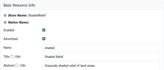 Name shadedTitle Shaded ReliefAbstract Grayscale shaded relief of land areas.The naming of a layer is important, and while GeoServer does not offer restrictions many of the individual protocols will only work with very simple names.