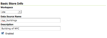 Once the workspace is created we are ready to add a new store. The store tells GeoServer how to connect to the database.