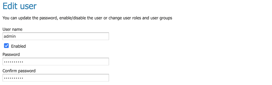 adminuser. You may also reach this screen by navigate to Security > Users, Groups, and Roles. Changing the the Users/Groups tag, and selecting theadminuser.